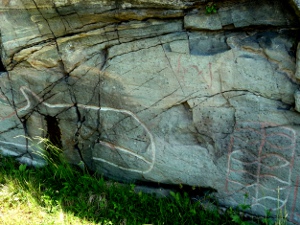 The carvings in the photo have been traced in with some paint and would be almost impossible to spot other wise. Usually the carvings are located on small flat outcrops on low headlands.